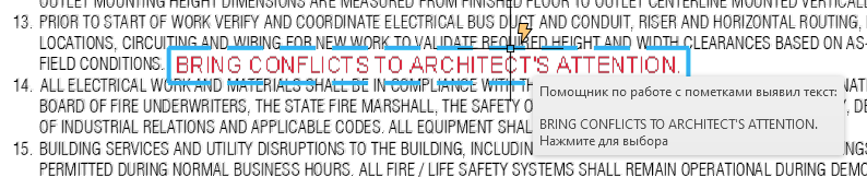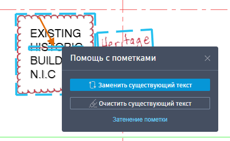 Функция «Помощь с пометками» предназначена для взаимодействия с импортированными пометками. Функция распознает обычный и перечеркнутый текст, выноски, пометочные облака, текстовые инструкции и комментарии PDF. При работе с пометкой, например при вставке пометочного облака или многострочного текста, объект добавляется в чертеж, а не в трассировку.