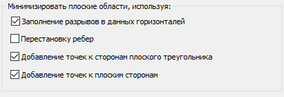 В процессе создания треугольников поверхности вокруг данных горизонталей в областях, где линии горизонталей вплотную следуют за кривыми, могут появляться ошибочные плоские треугольники, что создает ситуацию, в которой все три вершины треугольника могут располагаться на одной горизонтали. При добавлении данных горизонталей к поверхности необходимо понимать принцип использования параметров для минимизации плоских областей. В противном случае операция минимизации может выполняться очень медленно, и результирующая поверхность может быть неточной.