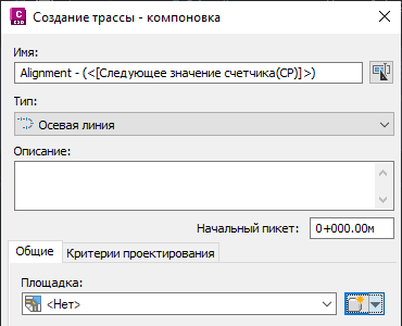 Если трасса создается в диалоговом окне "Создание трассы — компоновка" или "Создание трассы — из полилинии", по умолчанию площадка для нее не указывается <Нет>, как отображено на рисунке 2.