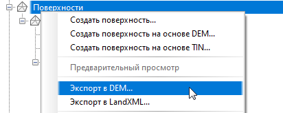 Autodesk Civil 3D позволяет экспортировать файлы DEM из поверхности. В момент экспорта можно увеличить шаг сетки, чтобы уменьшить размер файла. На рис. 3 изображено меню, используемое для запуска процесса экспорта.