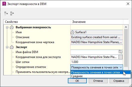 Важным параметром экспорта является метод определения отметки в каждой точке. Можно либо создавать выборку отметок поверхности в точке сетки, либо вычислять среднюю отметку по соседним точкам. Второй метод (усреднение) требует больших затрат времени. Для повышения эффективности следует использовать опцию выборки поверхности, как показано на рис. 4.