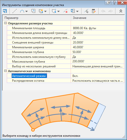 Установка флажка "Автоматический режим" для инструментов компоновки участков, как показано на рисунке 3, позволяет быстро сформировать несколько новых участков. Автоматический режим лучше использовать с симметричными площадями и областями однородной формы. Для участков неправильной формы или расположенных в углах используйте ручной режим компоновки.