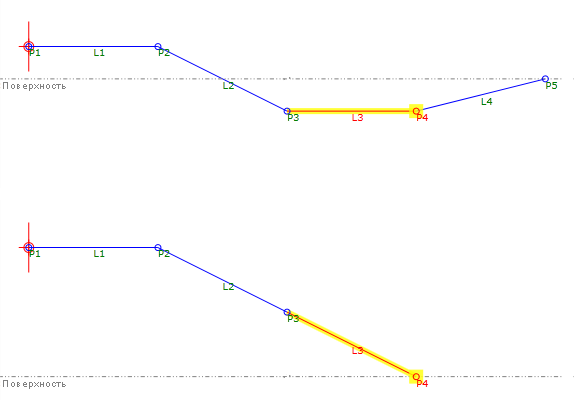 В этом примере для получения расстояния между P1 и целевой поверхностью используется дополнительная точка (Auxiliary Point). Сначала в зависимости от этого расстояния определяется, находится ли P1 в состоянии выемки или насыпи. Далее решения в ветвях выемки и насыпи используются для определения высоты насыпи или глубины выемки. Наконец, вычерчиваются P2 и L1 с откосом, указанным для данного условия.