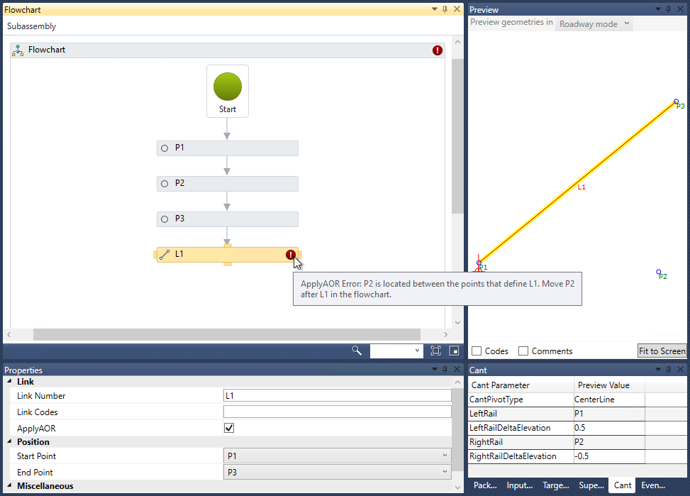 Если значения для предварительного просмотра возвышения наружного рельса заданы на вкладке «Возвышение наружного рельса» и устанавливается флажок ApplyAOR для звена, соединяющего начальную и конечную точки в Subassembly Composer, а на одну из них (начальную или конечную) ссылаются другие точки или звенья перед применением нового звена, на блок-схеме и на звене появится красный маркер ошибки. При наведении курсора на маркер ошибки на звене отобразится подробное сообщение об ошибке.