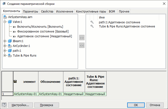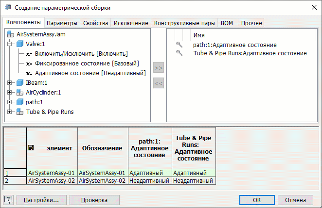 Прим.: Элемент главной сборки ветвей можно сделать адаптивным только один раз в параметрическом ряде сборок Inventor.