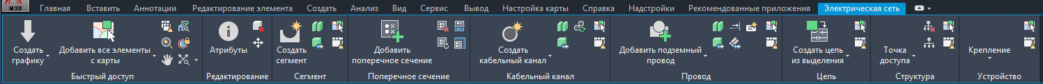 The Electric ribbon tab provides access to the most common operations in инструментарий AutoCAD Map 3D Electric. For example, you can create a segment using the Segment panel, add a Cross Section using the Cross Section panel, and then add ducts and conductors using the Duct and Conductor panels. Use the Circuit panel to define circuits by selecting the feature or by performing a trace. Use the Structure and Device panels to add structures and devices. The features you create using the Electric ribbon tab are displayed in the appropriate containers in the Electric Explorer. See Electric Explorer.