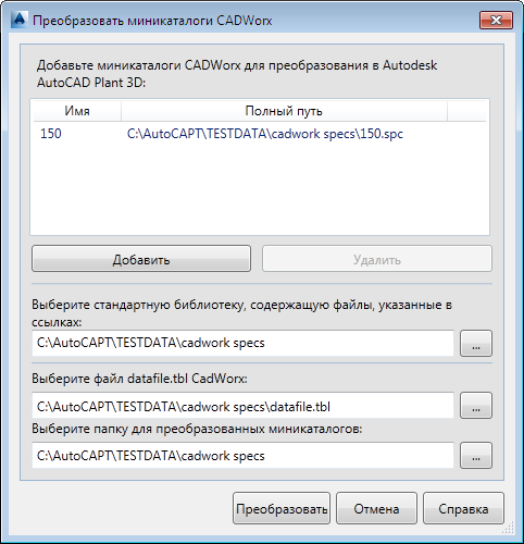 Перечисление миникаталогов и каталогов CADWorx, которые добавляются для преобразования.
