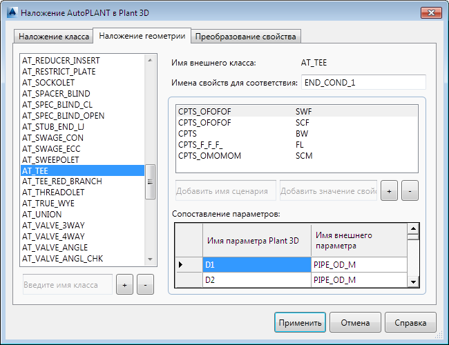 Пример инструкции наложения для преобразования: для выбранного наложения на панели выше, для параметра Plant 3D D1 использовать AutoPLANT PIPE_OD_M, для D2 использовать то же свойство и т. д.