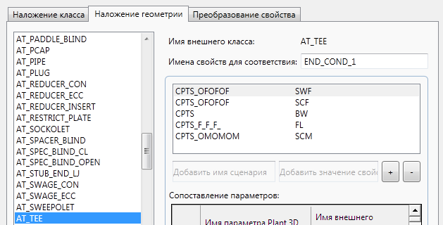 Каждый сценарий имеет связанные свойства, которые указывают, как должны быть нарисованы типы концов. Свойства AutoPLANT или CADWorx сопоставляются с версиями AutoCAD Plant 3D toolset. Во многих случаях может потребоваться, чтобы класс имел разные формы в зависимости от контекста. Например, может потребоваться, чтобы AT_TEE (AutoPLANT) или Tee (CADWorx) в разных местах имел сварной тройник, сварной тройник с муфтой или фланцевый тройник. Можно указать, что имя или имена свойств должны соответствовать используемой графической форме в качестве критериев.