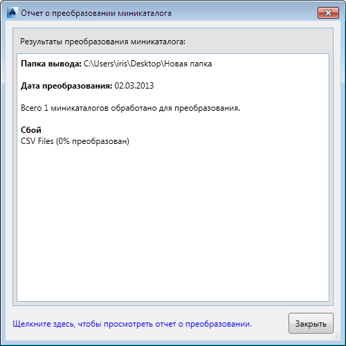 Отчет с указанием папки вывода, даты преобразования, количества преобразованных миникаталогов или каталогов и списка файлов MDB, которые были преобразованы частично.