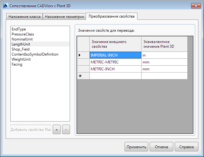 Преобразование значений свойств CADWorx в их эквиваленты Plant 3D.