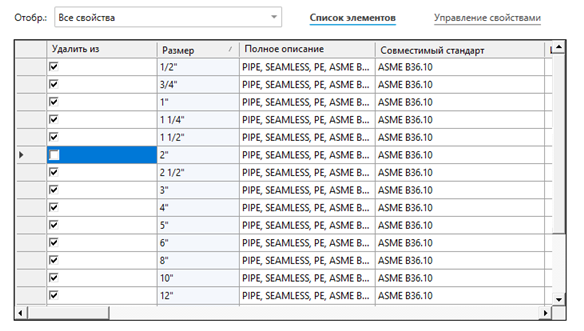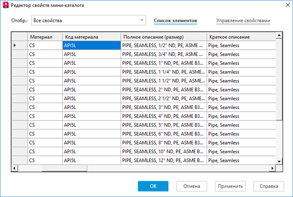 - На панели «Лист мини-каталога» редактора мини-каталогов щелкните нужную деталь (например, PIPE, PE, ASME B36.10).