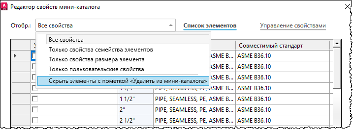 Прим.: Если размер компонента, который необходимо добавить, после снятия флажка «Скрыть элементы с пометкой "Удалить из мини-каталога"» не появляется, то для добавления нужного размера можно воспользоваться редактором каталогов.