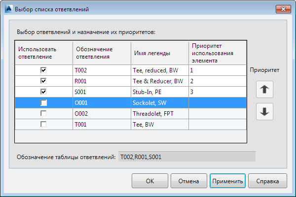 Отображение обозначения ответвления для типа ответвления. Можно добавлять и удалять обозначения ответвлений в диалоговом окне "Настройка таблицы ответвлений".