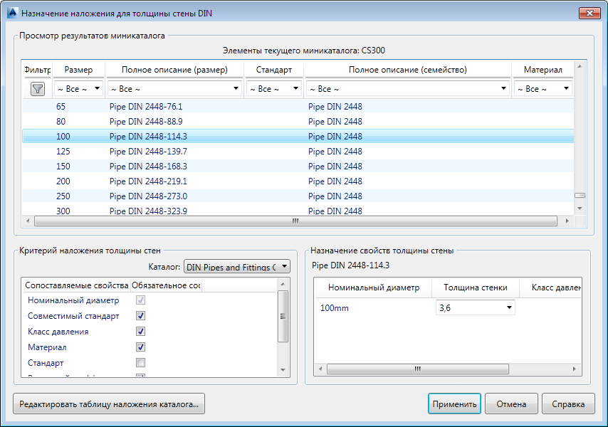 Назначает критерии наложения толщины стен для компонентов каталога DIN.