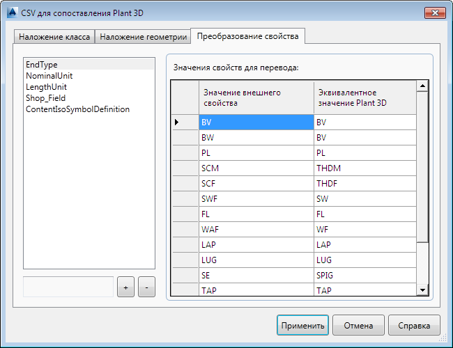 Преобразование значений свойств CSV в их эквиваленты Plant 3D.