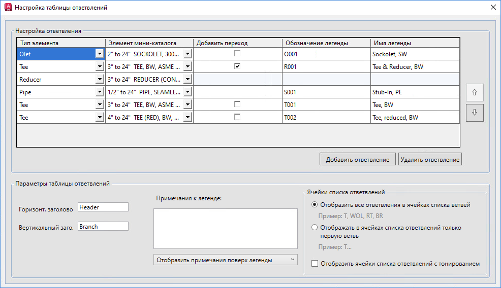 Определяет соединительные детали, которые используются в таблице ответвлений. Также можно установить параметры отображения для таблицы ответвлений.