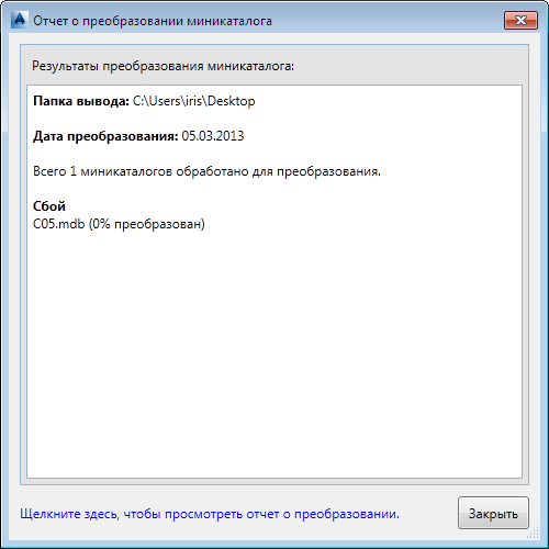Перечисляет результаты преобразования для миникаталогов или каталогов, преобразованных из формата AutoPLANT в формат Plant 3D.