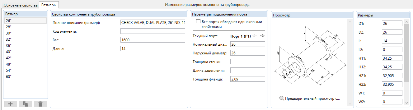 - Копирование свойств и измерений размера, выбранного в списке «Размеры». Новый размер значится в списке как неопределенный, пока ему не будет назначен уникальный номинальный диаметр.