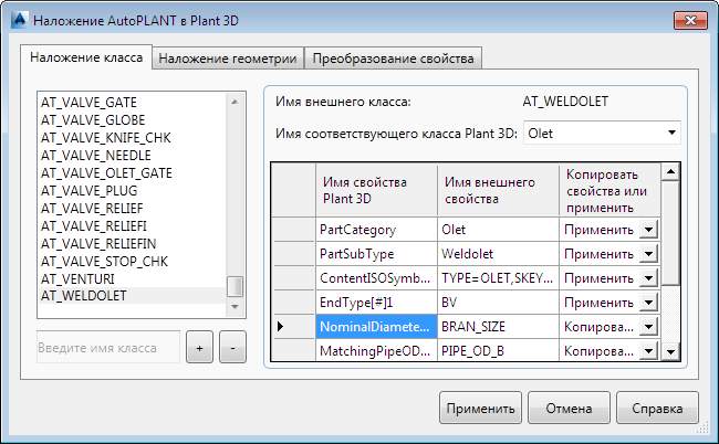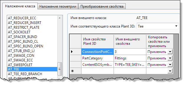 Общие·свойства, такие как полное описание, класс по давлению, миникаталог и прочие, можно сопоставить один раз для всех классов. С другой стороны, свойства отдельных классов сопоставляются с соответствующими свойствами классов Plant 3D индивидуально.