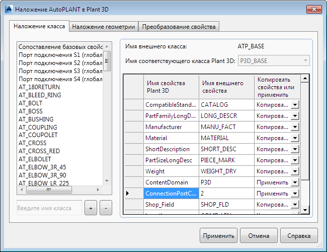 Сопоставления свойств отдельных классов имеют преимущество перед глобальными сопоставлениями. В диалоговом окне "Сопоставление AutoPLANT с Plant 3D", например, глобальным соответствием для ConnectionPortCount является 2.
