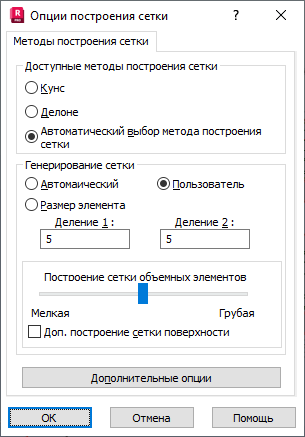 С помощью ползунка можно выбрать тип сетки объемных конечных элементов для создания: "Крупная" или "Мелкая". Если для генерации сетки объемных конечных элементов выбрать параметр "Дополнительное разбиение поверхности", будет также создана сетка на поверхности (контуре) твердого тела. Следует отметить, что при включении этой опции размеры объемных конечных элементов сетки уменьшаются.