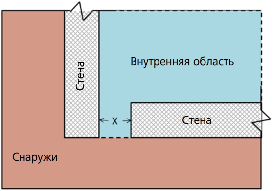 Такой подход можно проиллюстрировать примером, когда на виде плана показаны 2 стены, ограничивающие внутреннее пространство, с зазором X между ними.