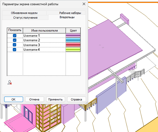 "Параметры экрана совместной работы". В модели отображается указанный цвет для соответствующего владельца.