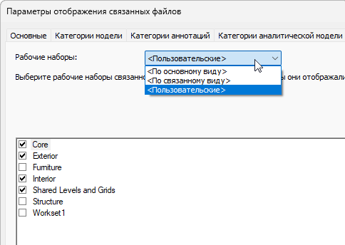 Перейдите на вкладку "Рабочие наборы" диалогового окна "Параметры отображения связанных файлов" для главной модели. На этой вкладке можно выбрать конкретные рабочие наборы для отображения на виде главной модели.
