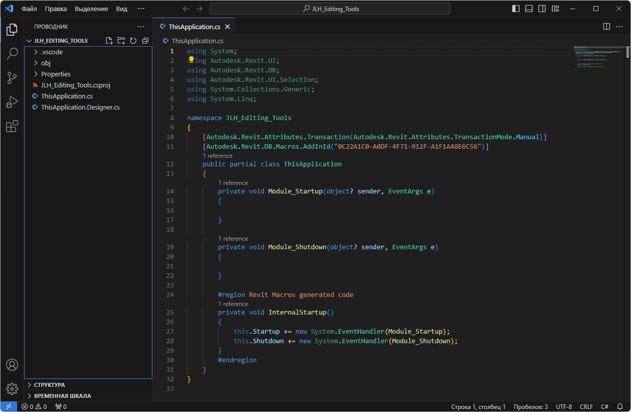 Например, если используется шаблон для макросов C# уровня приложения, в сеансе Visual Studio Code уже выполнено следующее: