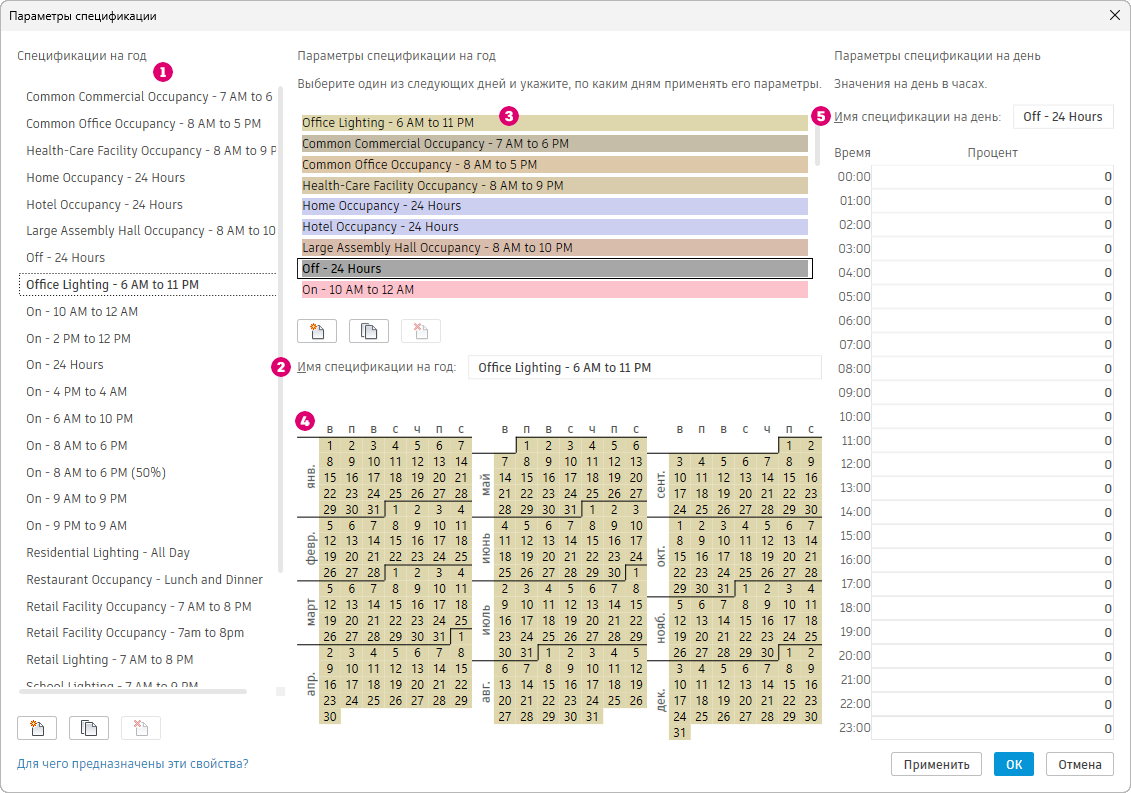 Для типа здания и отдельных пространств в пределах модели можно выбрать спецификации занятости, освещения и мощности.
