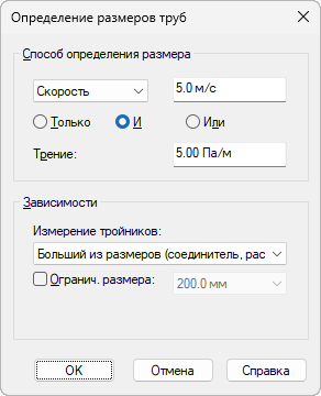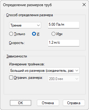 В диалоговом окне "Определение размеров труб" можно задать применение только одного из способов (выберите "Только") или сочетания обоих способов (выберите "И" или "Или").