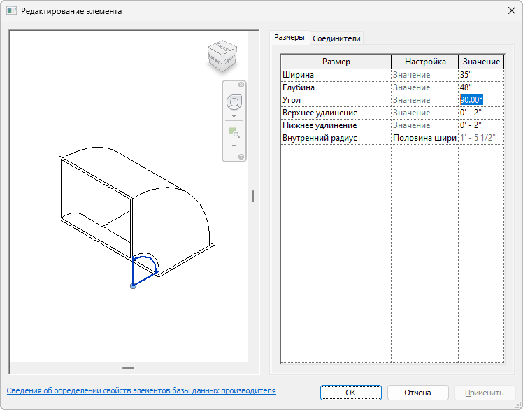 Элемент базы данных производителя можно редактировать в Revit, чтобы определить необходимые размерные значения и параметры.