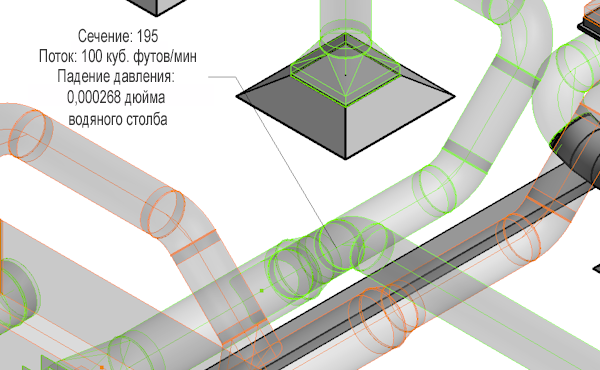 Создайте марки сегментов воздуховодов аналитической модели для отображения сведений о расчетах на основе сети для одного сегмента. Это можно использовать в качестве альтернативы инспектору систем, в частности, для сетей воздуховодов из базы данных производителя.