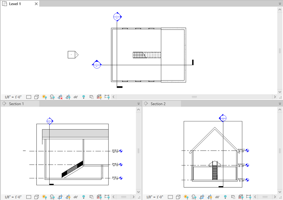 4. Закройте все виды, кроме двух разрезов и плана этажа, на котором требуется разместить пространство, и введите с клавиатуры w t для расположения этих трех видов без перекрывания.