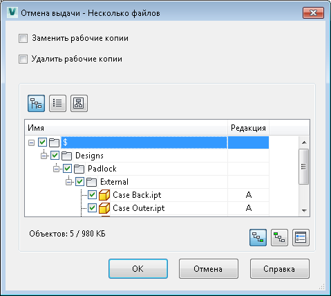 В диалоговом окне "Отменить выдачу" укажите, требуется ли заменить локальный файл текущей версией файла в хранилище и удалить рабочую копию файла. Выберите «Заменить рабочие копии» для сброса всех изменений, которые выполнены для рабочей копии файла.