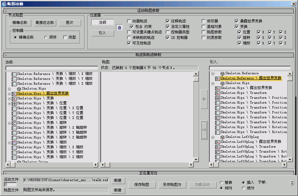 “映射动画”对话框用于在使用“加载动画”命令时指定引入动画轨迹。此对话框可调整大小,并且包含三个卷展:设置基本参数;进行实际贴图;正在重定目标