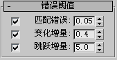 “摄影机跟踪器”的“错误阈值”卷展栏通过获取测量值并将它们与您在此卷展栏中设置的阈值相比较,来识别特征点跟踪。您可以在手动跟踪检查(请参见“批量跟踪”卷展栏)过程中或在实际跟踪过程中使用此检测,以便使用“运动跟踪器”卷展栏“设置”组中的“错误时重采样”控件更正错误。