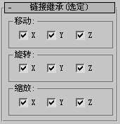 使用“链接继承”(选定)工具约束用于任何位置、旋转或缩放轴的选择集中的多个对象之间的链接。