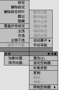 右键单击“关键点”窗口或“层次”列表可显示四元菜单,在此可即时访问各种工具。该菜单是上下文敏感的,因此其内容会有所变化,具体取决于高亮显示的内容。例如,当“层次”列表处于活动状态时,可以指定复制和粘贴控制器,并打开可以设置动画的属性。您可以设置“自动扩展”和“手动导航”控件,以更改“控制器”窗口显示的行为。