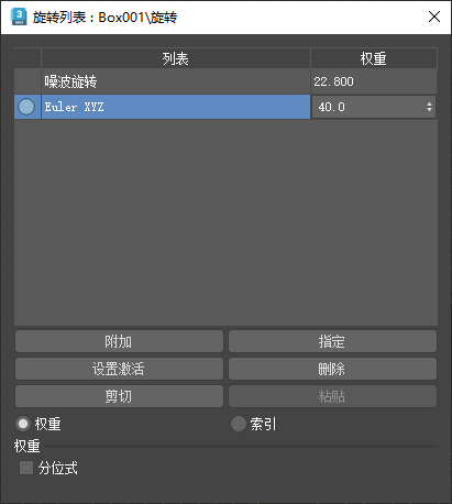 | 单独加权 | 单独对列表条目进行加权,然后进行组合。旋转分量权重钳制在 [-100%,100%] 之间。