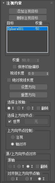 一旦指定注视约束,可以在“运动”面板的“注视约束”卷展栏上访问它的属性。在此卷展栏上,可以添加或删除目标、指定权重、指定目标权重值和设置目标权重值的动画,以及调整其他相关参数。