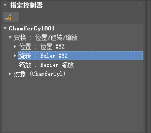 Euler XYZ 旋转控制器是一个复杂的控制器,它可以合并单独的、单值浮点控制器来给 X、Y、Z 轴指定旋转角度。Euler XYZ 不如四元旋转(由 TCB 旋转控制器使用)平滑,但它是唯一可以用于编辑旋转功能曲线的旋转类型。
