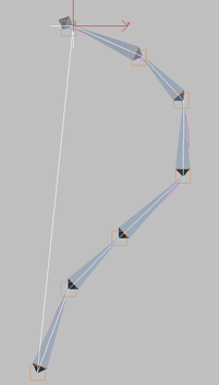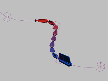 你可以移动和设置样条线顶点动画来更改样条线的曲率。通常,每个顶点都放置了一个辅助对象,用来辅助设置样条线的动画。随后样条线曲率传递到整个链接结构中。骨骼自身并不改变形状。