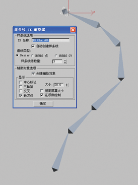 该过程根据对话框设置自动绘制样条线,并设置样条线 IK 系统来使用样条线。3ds Max 自动将“路径”约束指定给根骨骼,将其约束到位于样条线末端的辅助对象/顶点。