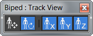 利用 Biped 工具栏上的工具,可以选择要在“曲线编辑器”中显示的动画曲线。可以在位置和旋转曲线之间切换,也可以切换表示当前 Biped 选择的 X、Y 和 Z 轴的单个曲线。