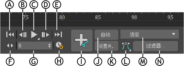 动画和时间控件:A. 转至开始,B. 上一帧/上一关键点,C. 播放/停止,D. 下一帧/下一关键点,E. 转至结尾,F. 关键点模式切换,G. 当前帧(转到帧),H. 时间配置,I. 设置关键点动画模式,J. 自动关键点模式切换,K. 设置关键点模式切换,L. 新关键点的默认入/出切线,M. 选择列表,N. 关键点过滤器
