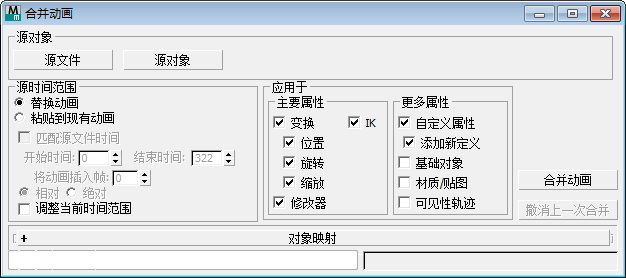 “合并对象”将一个对象中的动画数据合并(传输)到另一个对象中去。可以将动画数据从一个场景传输到另一个场景,或在相同场景中的对象之间进行传输。来自几个对象的动画数据可以同时进行合并。