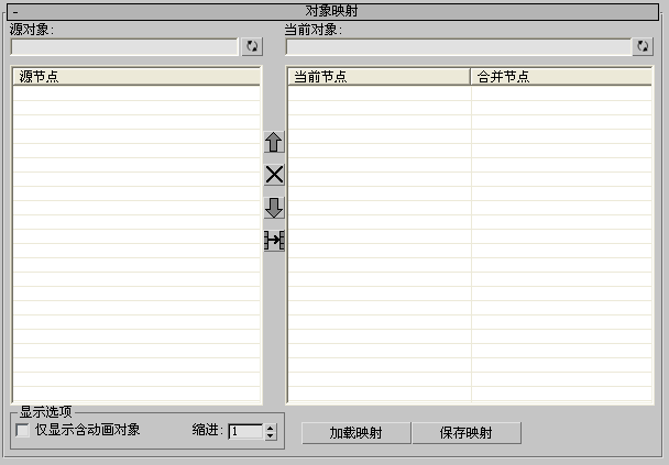 为源对象和目标对象建立一对一的对应关系(映射)。位于“合并节点”栏中的对象上的动画数据将合并到“当前节点”栏中的相应对象上。