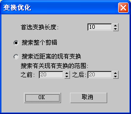 “变换优化”对话框中的选项可用于选择优化算法将在哪些范围内搜索变换。可搜索整个剪辑,还可在现有变换的附近搜索。必须指定优化变换的首选长度。3ds Max 将尝试尽可能接近指定的长度,同时仍选择提供最佳长度。